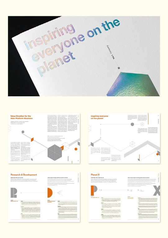 iF 디자인 어워드를 수상한 SK플래닛의 기업 브로슈어는 다양한 사업 영역을 포괄하는 기업의 특성을 감안해 제작된 책자로, 두 권의 책을 한 손으로 편리하게 쥐고 볼 수 있도록 만들어 졌다. 또한, 홀로그램박 가공으로 엣지를 준 창의적 표지와 최소한의 디자인 요소를 활용해 현대적이고 실리적인 디자인을 함께 추구했다.