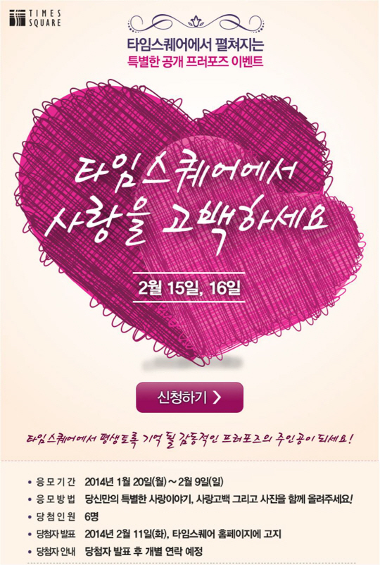 복합쇼핑몰 경방 타임스퀘어가 다가오는 밸런타인데이를 맞아 '공개 프러포즈 이벤트'에 참여할 커플을 모집한다고 27일 밝혔다.