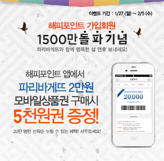 파리크라상의 파리바게뜨가 해피포인트카드 회원 1500만명 돌파를 기념해 파리바게뜨 모바일상품권 구매하기 이벤트를 마련했다.
