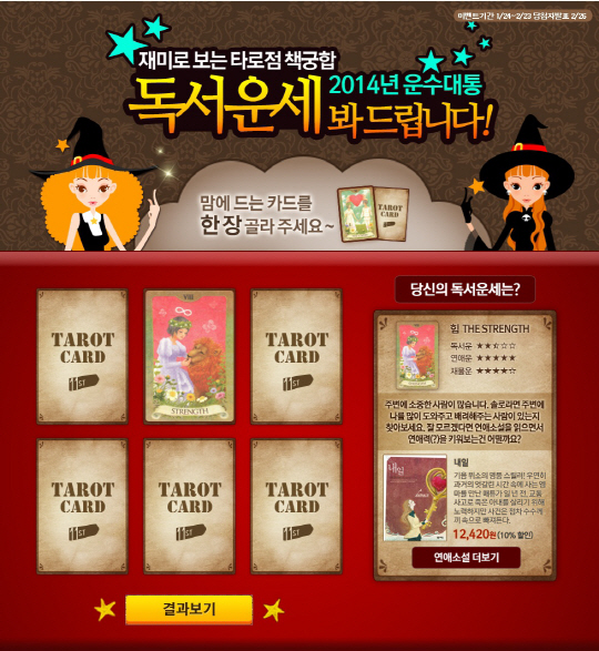 타로 카드를 뽑은 뒤 고객에게 매칭된 도서를 구매시 최대 50% 할인 판매도 한다. 구매 고객은 추첨을 통해 새해 꼭 필요한 '건강'과 '지혜'의 선물인 헬스싸이클(1등 2명), 도서MD의 추천도서 10권(2등 10명)을 증정한다.