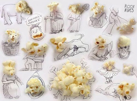 '팝콘으로 만든 얼굴' 그림은 포르투칼에 거주하는 한 남성이 만든 것으로, 그는 팝콘을 종이 위에 올려놓고 그 부근에 펜으로 그림을 그려 작품을 완성했다. 또 팝콘 얼굴의 디테일까지 신경쓰는 세밀함으로 보는 이들의 놀라움을 자아낸다.