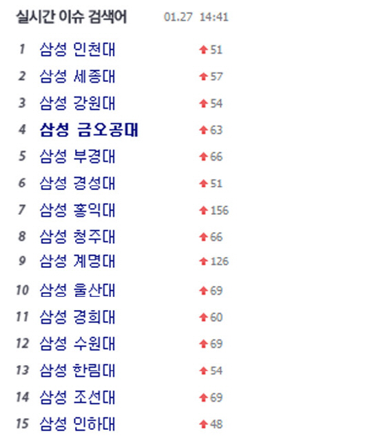 27일 현재 (오후2시 40분) 포털사이트 다음의 '실시간 이슈 검색어'에는 삼성 인천대, 삼성 세종대, 삼성 강원대, 삼성 금오공대, 삼성 부경대, 삼성 경성대, 삼성 홍익대, 삼성 청주대, 삼성 계명대, 삼성 울산대, 삼성 경희대, 삼성 수원대, 삼성 한림대, 삼성 조선대, 삼성 인하대 순으로 1위부터 15위까지 채워져 있다. 다음 사이트를 새로고침하면, 대학교의 이름 순위만 바뀔 뿐 '삼성XX대' 검색어는 계속 가득 차 있다.