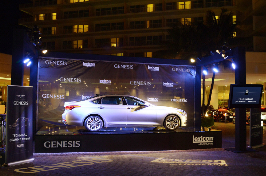 26일(미국 현지시각) '제56회 그래미 어워즈'가 진행된 미국 캘리포니아 LA 스테이플스센터에 '렉시콘' 프리미엄 사운드 시스템이 탑재된 신형 제네시스가 전시, 조명을 받고 있다.