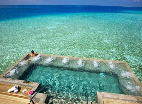 사진 속 풀장은 몰디브의 한 산호섬에 있는 호텔의 풍경으로, 수영이나 스파를 즐기면서 푸른 바다를 볼 수 있도록 만들어졌다. 특히 끝도 없이 펼쳐진 에메랄드빛 바다를 온몸으로 느끼며 휴식을 취할 수 있어 많은 이들의 휴가 욕구를 자극 시키고 있다.