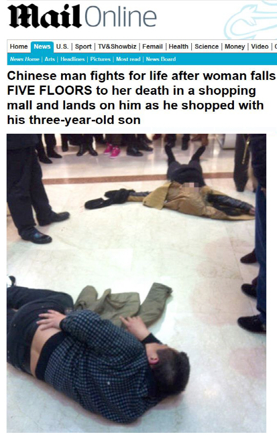 쇼핑몰을 찾은 40대 남성이 5층 높이에서 추락한 여성과 부딪혀 중상을 입은 사고가 발생했다.