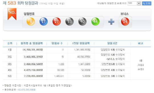 1일 제583회차 로또복권을 추첨한 결과, 1등에 당첨된 사람은 총 11명으로 각 13억4184만원을 받게됐다.