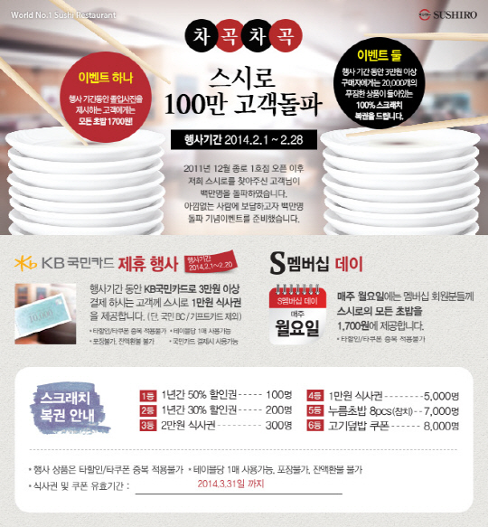 5, 6등에 당첨된 1만5000명에게는 누름초밥과 고기덮밥을 무료로 즐길 수 있는 쿠폰이 제공된다. 또 2월 졸업시즌을 맞아 본인의 졸업 사진을 제시하는 고객에게 모든 스시접시를 1700원 균일가에 판매한다.