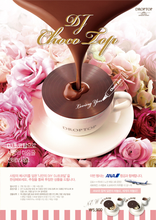 프랜차이즈 커피 전문점 드롭탑이 발렌타인데이를 맞아 초코펜으로 직접 사랑의 문구를 새길 수 있는 DIY(Do It Yourself)음료 'DJ초코탑'을 선보였다.