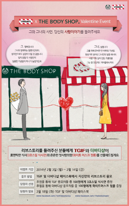 TGI프라이데이스 관계자는 "이번 더바디샵과의 공동 이벤트 운영은 단순 경품 및 사은품 제공 외에 발렌타인데이 맞이 연인들에게 사랑을 추억하고, 사연을 통해 서로의 사랑을 느끼게 하기 위한 의미로 기획됐다"며 "자신 만의 러브 스토리를 통해 달콤한 사랑의 감정을 표현하기 바란다"고 말했다.