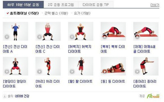 '하루 15분 다이어트' 게시물에는 유명 헬스 트레이너인 숀리가, 전신, 복부, 허벅지, 하체 등 신체 각 부분의 다이어트 동작을 선보이고 있다.