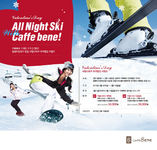 5일부터 14일까지 해당 기간의 날짜가 적힌 카페베네 영수증을 가지고 발렌타인데이에 비발디파크를 방문하면 할인된 가격으로 스키를 즐길 수 있다. 먼저, 자정 12시부터 오전 5시까지 이용할 수 있는 새벽권은 리프트권과 장비렌탈 포함 8만원에서 3만4000원의 할인 가격으로 제공되며, 저녁 10시부터 다음날 새벽 5시까지 이용 가능한 밤샘권도 리프트권과 장비렌탈 포함 가격인 9만4000원에서 3만9000원의 저렴한 비용으로 구입할 수 있다.