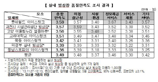 품질 만족도는 평균 3.49점(5점 만점)으로 평가됐다. 빙상장별로는 롯데월드 아이스링크(3.59점)가 가장 높고, 다음은 과천시 시설관리공단 빙상장(3.57점), 고양 어울림누리 얼음마루(3.56점) 순으로 나타났다.