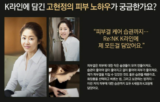 실제로 배우 고현정은 자신이 사용하고 있는 화장품의 품질 및 취향을 반영해서 '리:엔케이(Re:NK)'라는 제품을 출시했다. '리:엔케이(Re:NK)'라는 제품은 고현정이 직접 사용하는 브랜드라는 점을 소비자에게 강력하게 어필해서 브랜드 론칭과 동시에 인기를 끌고 있다.