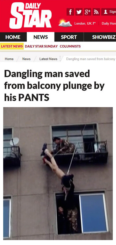 베란다에서 추락한 남성이 바지 덕분에 목숨을 건졌다는 소식이 전해졌다.