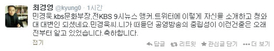 5일 최경영은 자신의 트위터에 "민경욱, 'KBS 문화부장, 전 9시 뉴스 앵커'라고 트위터에 자신을 소개하고 청와대 대변인 되셨네요"라며 "네가 떠들던 공영방송의 중립성이 이런 건 줄은 오래전부터 알고 있었습니다. 축하합니다"라며 맹비난 했다.