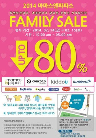 마마스앤파파스의 공식수입처 ㈜모와부(대표 김승식)가 최대 80% 할인하는 '패밀리세일'을 개최한다. 2월 14일부터 15일까지 이틀간 진행되는 마마스앤파파스 패밀리세일은 상암월드컵경기장 리셉션홀에서 오전 10시부터 오후 5시까지 열린다.
