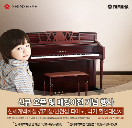 세계적 악기음향전문기업 야마하뮤직코리아㈜는 신세계백화점 경기점과 인천점에 새로 오픈한 자사 매장을 알리고 이를 기념하기 위해 피아노를 포함한 다양한 클래식 악기를 특별가에 판매하는 소비자 이벤트를 실시한다고 밝혔다.
