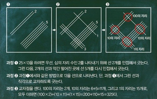 이는 곱셈을 덧셈으로 환원하는 원리를 이용한 것으로, 해당 교차점의 개수에 따라 수를 더한 값이 된다.