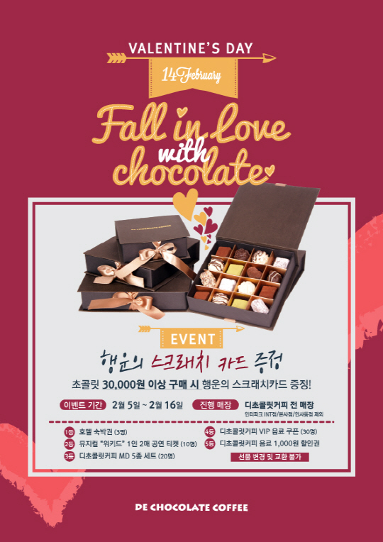 디초콜릿커피는 발렌타인데이 초콜릿 선물세트 출시를 기념해 16일까지 초콜릿 3만원 이상 구매 고객 전원에게 행운의 스크래치카드를 증정한다. 스크래치카드는 호텔 숙박권, 뮤지컬 티켓 등 다양한 경품이 숨어 있다.