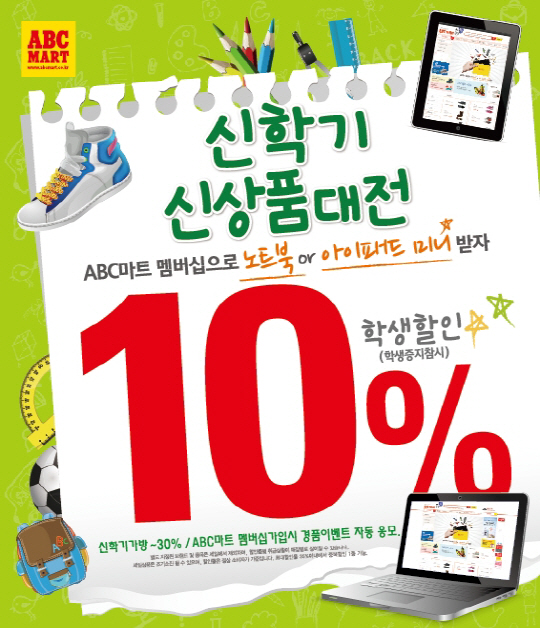 이벤트 응모자 중 추첨을 통해 1등은 삼성 노트북(3명), 2등은 아이패드미니(10명), 3등은 ABC마트 상품권 5만원(100명), 4등은 문화상품권 1만원(200명) 등 푸짐한 경품을 증정한다. 당첨자는 오는 3월 25일 ABC마트 온라인 쇼핑몰 및 개별 연락을 통해 확인할 수 있다.