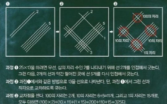 '구구단 필요 없는 곱셈법'은 한 포털사이트 지식백과 페이지에 게재된 것으로, 단순히 선 긋기만으로도 곱셈 값을 얻어낼 수 있어 보는 이들을 놀라움을 자아낸다.
