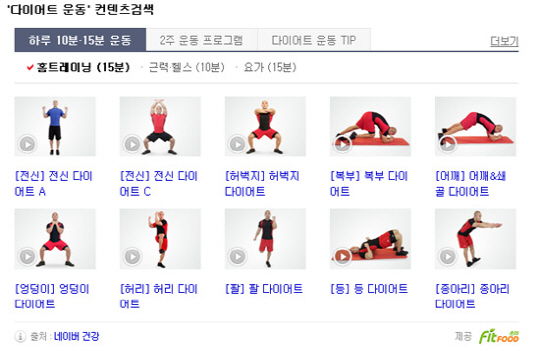 '하루 15분 다이어트' 영상을 보면 트레이너가 전신, 복부, 허벅지, 하체 등 신체 각 부분의 다이어트 동작을 선보인다.