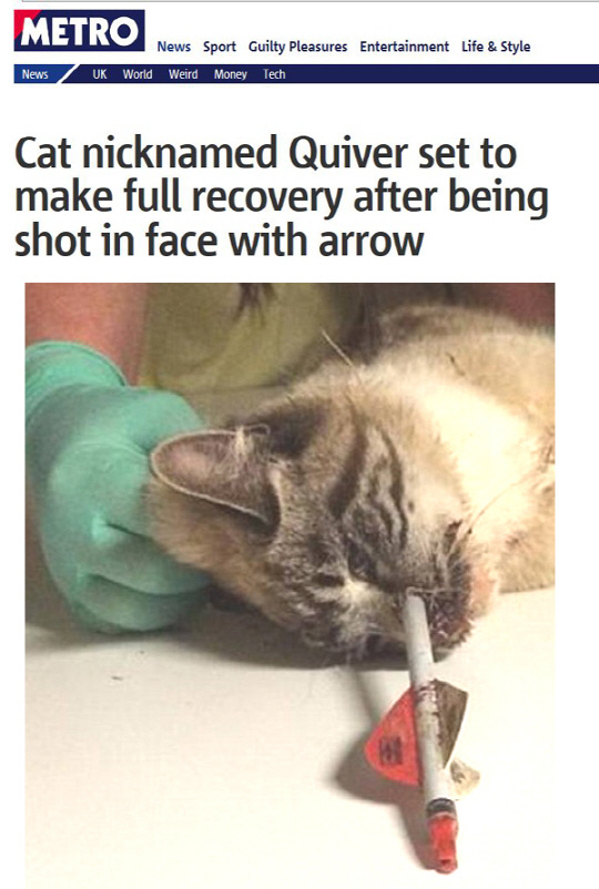 이 고양이는 현재 '퀴버(화살 보관통)'라는 별명을 얻었으며 병원에서 회복 중인 것으로 알려졌다.