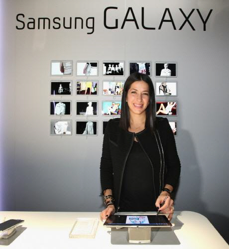 ◇삼성전자는 뉴욕 맨해튼 링컨센터에서 진행되는 2014년 F/W 뉴욕 패션위크에 '삼성 패션 커넥티드' 체험존을 마련해 갤럭시 노트 프로, 갤럭시 노트3, UHD TV 등을 통해 통합된 제품 경험을 제공한다. 2014년 F/W 뉴욕 패션위크에서 새로운 콜렉션을 선보인 디자이너 레베카 밍코프가 삼성 패션 커넥티드 체험존을 방문한 모습.