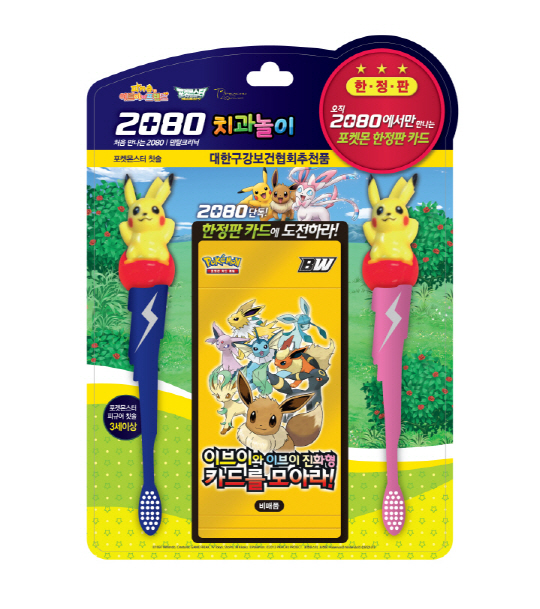 2080 치과놀이 포켓몬스터 어린이칫솔은 3만개 한정 판매되는 제품으로 오직 2080을 통해서만 구입할 수 있는 포켓몬스터 한정판 카드를 함께 구성해 희소성을 높였다. 최근 개봉한 포켓몬스터 극장판에 등장하는 이브이와 이브이 진화형 캐릭터 8종이 그려진 카드가 랜덤으로 2장씩 삽입되어 있다.