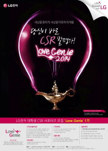 LG전자는 10일부터 다음달 9일까지 대학생 CSR서포터즈 프로그램인 '러브지니(Love Genie)' 1기에 참여할 학생 40명을 모집한다. 서류전형, 심층면접을 거쳐 내달 24일 서포터즈 1기의 명단을 발표한다.