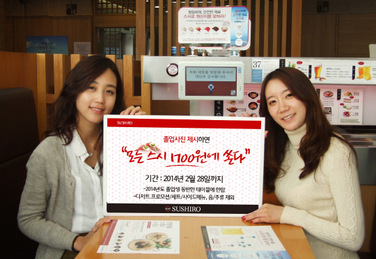 회전초밥 레스토랑 스시로한국은 오는 28일까지 본인의 졸업 사진을 제시하는 고객에게 모든 스시접시를 1700원 균일가에 판매한다. 스시로 전 영업장에서 동시에 진행되며 2014년도 졸업생을 동반한 테이블에 한해 1700원 균일가 혜택이 적용된다. 또 같은 기간 동안 스시로는 100만 고객돌파를 기념해 3만원 이상 결제한 고객에게 꽝이 없는 100% 당첨 스크래치 복권을 제공한다. 총 2만여명에게 제공되는 이번 스크래치 복권은 1등 100명에게 연간 50% 상시 할인권을, 2등 200명에게는 연간 30% 할인권, 3등 300명에게는 '2만원 식사권', 4등 5000명에게는 '1만원 식사권'을 각각 증정한다.