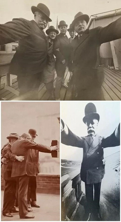 공개된 사진 속에는 나이 지긋한 중절모른 쓴 신사들이 카메라 앞에 모여 셀카를 찍고 있으며, 특히 카메라의 크기와 요즘과 별반 다를 바 없는 셀카 각도를 뽐내고 있어 웃음을 자아낸다.