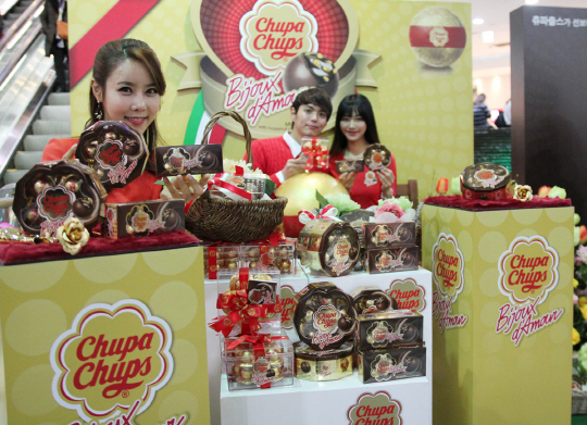 막대사탕 브랜드 츄파춥스는 11일 신세계백화점 서울 강남점에서 세계 최초로 이탈리아 프리미엄 초콜릿 '비쥬 드 아모르(Bijoux d'Amour·소중한 사랑)'를 출시한 것을 기념해 '소중한 사랑을 전해요' 행사를 선보였다.