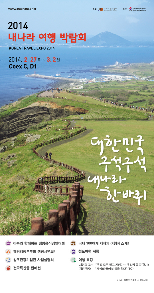 국내 유일의 국내여행 전문 박람회가 열린다. 오는 27일부터 3월 2일까지 나흘간 서울 삼성동 코엑스 C, D1홀에서 열리는 '2014 내나라여행박람회'에 우리나라의 여행지들이 한 자리에 모인다. 올해로 11회째를 맞아 '대한민국 구석구석, 내나라 한바퀴'라는 슬로건으로 열리는 이번 '2014 내나라여행박람회'는 문화체육관광부(장관 유진룡)이 주최하고 한국관광협회중앙회(회장 남상만)이 주관하는 국내관광 전문 전시회로 이번 행사는 300여 단체, 500여 부스 규모로 개최된다.