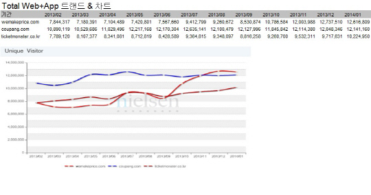 온라인 트래픽 측정 기관인 닐슨코리안클릭이 최근 발표한 자료에 따르면 소셜커머스 3사의 PC와 모바일웹 그리고 모바일앱 3개 부문 전체 통합 방문자수에서 위메프는 지난해 12월에 이어 올 1월에도 1위에 올랐다.