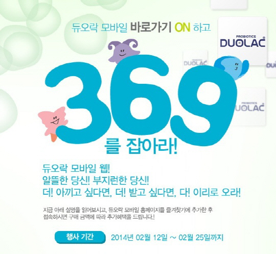 프로바이오틱스 유산균 전문기업 ㈜쎌바이오텍(대표 정명준)은 12일부터 25일까지 모바일 쇼핑을 즐기는 소비자들을 위해 '듀오락 모바일 바로가기 ON하고 369를 잡아라' 이벤트를 자사 쇼핑몰인 '듀오락몰(www.duolac.co.kr)'에서 진행한다.