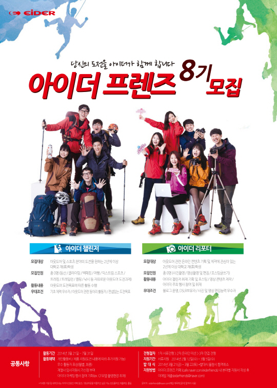 아이더 프렌즈 8기 모집에는 아웃도어와 스포츠 분야의 도전을 즐기고 온라인, 영상 마케팅에 관심이 많은 2년제 이상 대학생(휴학생 포함)이면 누구나 지원 가능하다. 참여를 원하는 대학생은 아이더 프렌즈 카페(cafe.naver.com/eiderfriends) 내 분야별 지원서를 다운받아 작성한 후 이메일(eiderfriends@naver.com)로 제출하면 된다.