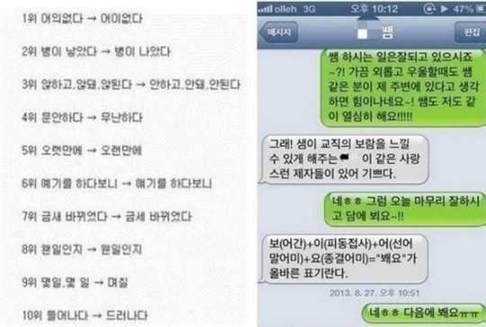 사진 속에는 스승과 제자가 주고 받은 문자 내용이 담겨 있다. 문자메시지에서 선생님께 안부 인사를 묻던 학생이 "네 그럼 오늘 마무리 잘하시고 담에 뵈요"라고 보내자 선생님은 "보(어간)+이(피동접사)+어(선어말어미)+요(종결어미)=봬요'가 올바른 표기란다"고 제자의 잘못된 맞춤법을 교정하고 있다.