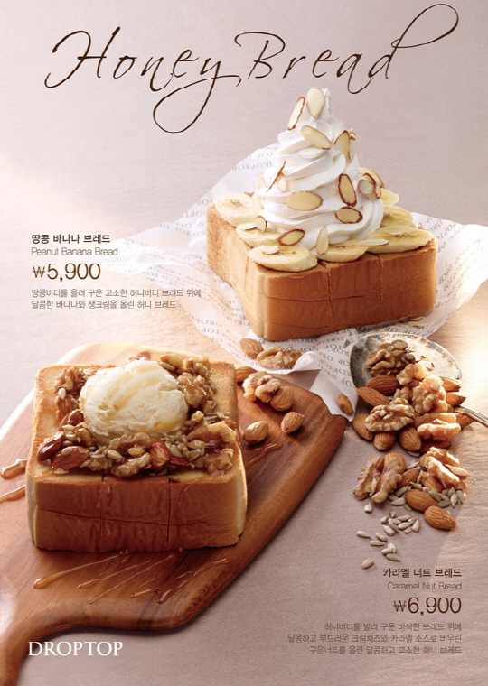 드롭탑의 '카라멜 너트 브레드'는 허니버터를 발라 구워, 속은 쫄깃하고 겉은 바삭한 사각 브레드에 깊은 치즈향과 부드러운 식감이 일품인 크림치즈를 가득 올린 것이 특징이다. 여기에 달콤한 카라멜 소스로 버무린 호두, 잣, 땅콩 등의 각종 견과류를 얹어 짭조름한 치즈 맛과 고소한 달콤함이 절묘한 조화를 이룬다. '땅콩 바나나 브레드'는 허니버터 브레드 위에 고소한 땅콩 버터를 더해 구운 뒤, 신선한 생과일 바나나를 얇게 슬라이스해 브레드 위에 깔고 풍부한 생크림을 올려 달콤함을 배가 시켰다.