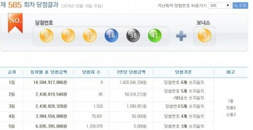 로또 585회 당첨번호 6,7,10,16,38,41…1등 총 9명 각각 16억씩