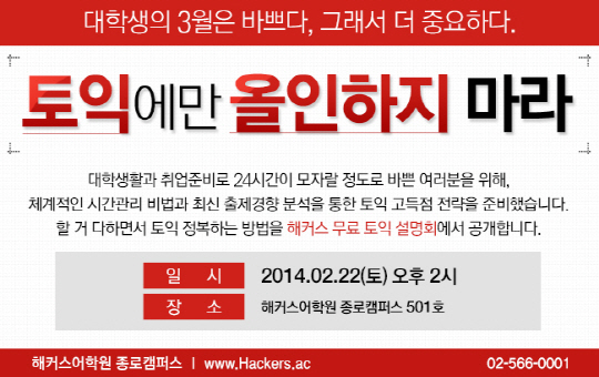 해커스 교육그룹 관계자는 "2월 마지막 토익시험은 3월부터 시작되는 상반기 대기업 취업 스펙을 완성할 수 있는 마지막 기회이며, 이번 토익설명회는 단시간 토익 공부를 통해 목표점수달성이 가능한 전략이 제공되므로 상반기 취업을 준비하는 수험생들에게 큰 도움이 될 것"이라며 "3월은 신학기임과 동시에 상반기 공채가 시작되는 바쁜 시기인 만큼 시간을 효율적으로 사용하기 위해 토익설명회나 삼성 SSAT 특강 등을 통해 명확한 학습 가이드라인을 잡는 도움을 얻길 바란다"고 전했다.