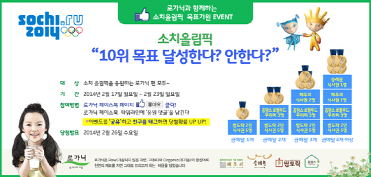 로가닉이 소치올림픽에서 한국의 종합 10위권 목표달성 기원을 위한 '2014 소치 올림픽 응원댓글 달기 이벤트'를 페이스북(www.facebook.com/Rawganiclove)에서 진행한다.
