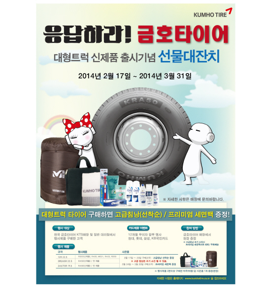 금호타이어(대표 김창규)가 대형트럭 타이어 신제품 RS55, RA50 출시를 기념해 17일부터 3월 31일까지 대형타이어 구매고객 대상 사은 이벤트를 실시한다.
