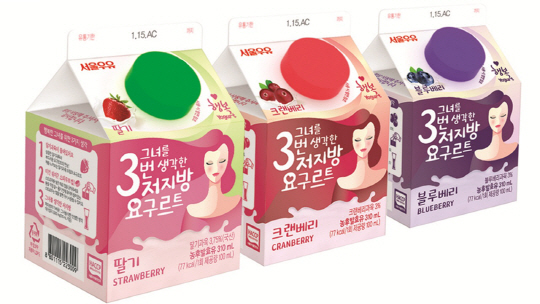 서울우유협동조합이 칼로리 부담을 낮춘 저지방 농후발효유 '그녀를 3번 생각한 저지방 요구르트' 3종을 새롭게 선보인다.