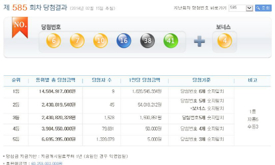 15일 제585회차 로또복권을 추첨한 결과, 1등에 당첨된 사람은 총 9명으로 각 16억2054만원을 받게됐다.