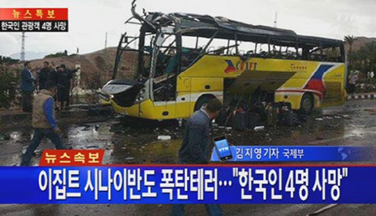 16일(한국시간) 이집트 현지언론은 이집트 동북부 시나이반도에서 관광버스를 겨냥한 폭탄 테러가 발생해 한국인 관광객 3명과 이집트 운전사 1명이 숨졌고, 12여 명이 다쳐 인근 명원으로 옮겨져 치료를 받고 있다고 보도했다.