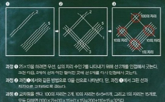 '구구단 필요 없는 곱셈법'은 한 포털사이트 지식백과 페이지에 게재된 것으로, 단순히 선 긋기만으로도 곱셈 값을 얻어낼 수 있어 보는 이들을 놀라움을 자아낸다.