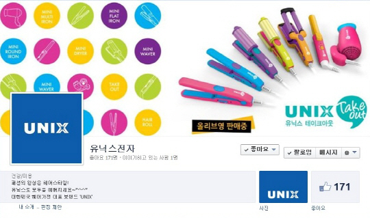 유닉스전자(대표 이충구)가공식 페이스북 리뉴얼 오픈을 기념, 소비자 이벤트를 진행한다. 이벤트는 유닉스전자의 페이스북에 방문해 좋아요를 누르면 누구든지 응모 가능하다. 유닉스전자 페이스북에서 좋아요를 참여한 후 리뉴얼 오픈 축하 댓글을 작성하고 지인들에게 추천하면 댓글 추첨 및 지인들에게 많은 추천을 해준 참여 소비자 순으로 유닉스전자의 인기상품인 '테이크 아웃' 헤어 스타일러가 20명에게 제공된다. 이벤트 기간은 오는 2월 25일까지 일주일 간 진행된다. 테이크 아웃'은 헤어스타일도 메이크업처럼 언제 어디서든 수정할 수 있는 신개념 카테고리 패키지로, 파우치에 넣어 휴대 가능한 미니사이즈에 라운드 아이론, 웨이버, 플랫 아이론, 멀티 아이론 등 기능성은 극대화해서 출시 직후 인기리에 판매되는 제품으로, 올리브영 전 매장 및 올리브영 온라인샵에서 구입 가능하다.