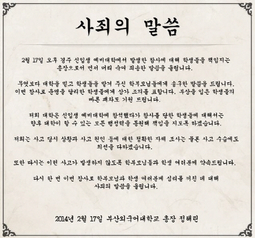 정해린 총장은 "17일 오후 경주 신입생 예비대학에서 발생한 참사에 대해 학생들을 책임지는 총장으로서 먼저 머리 숙여 죄송한 말씀을 올린다"라며 이번 사고와 관련해 사과의 말을 건넸다.