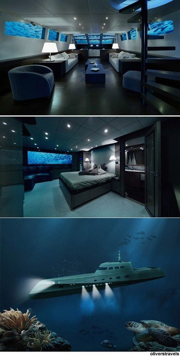 '초호화 잠수함 호텔' 영국의 한 회사가 억만장자 고객들을 위해 내놓은 상품으로, 전용 요리사가 만드는 최고급 요리와 고급 샴페인이 제공되며 객실엔 초대형 평면 TV, 호화스런 욕실 그리고 카리브해의 수중 풍경을 감상할 수 있는 넓은 창이 존재한다.